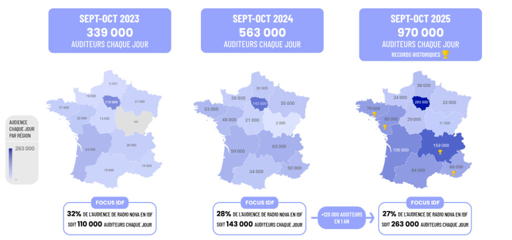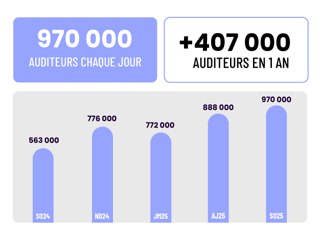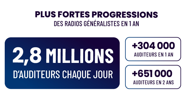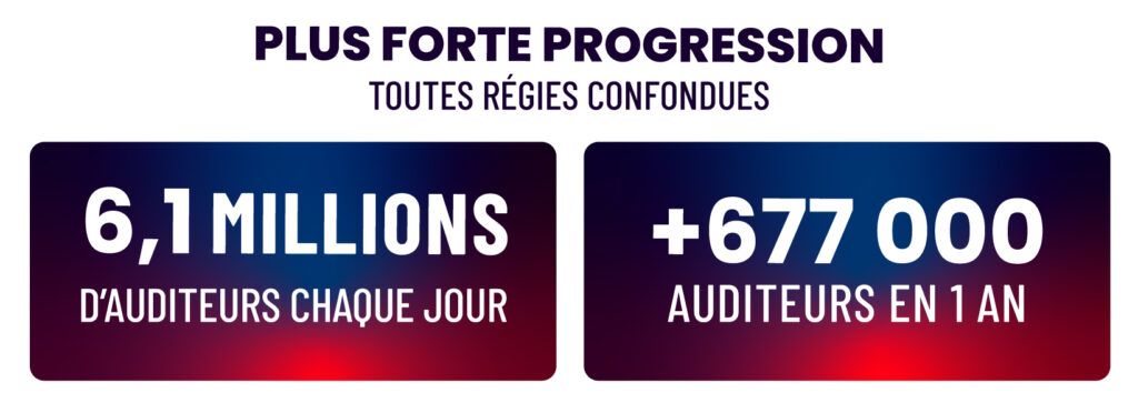 Source : Médiamétrie EAR National, SO25, SO24 et SO23, LàV, 5h-24h, Audience cumulée sur les différentes régions. Record historique depuis la création de la mesure.