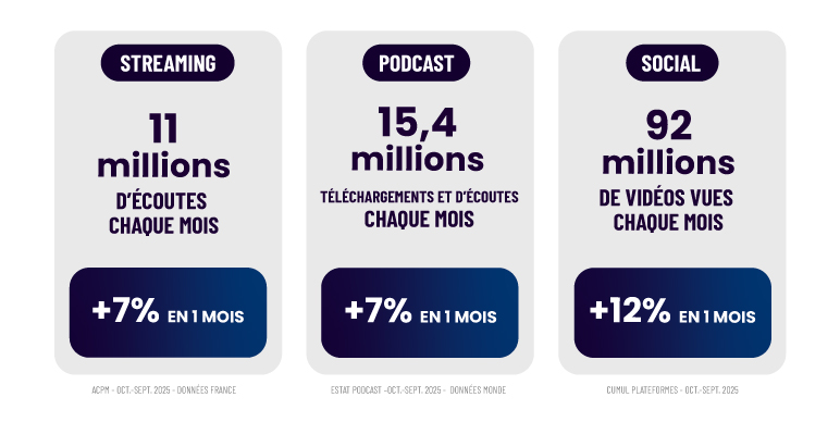 Source : Médiamétrie EAR National SO 25, LàV 5H-24h, Durée d’écoute 13ans et +, Agrégat nouveaux programmes musicaux
